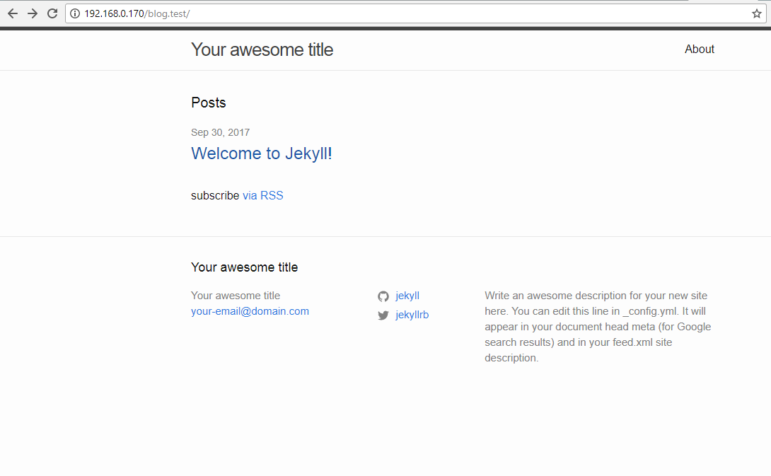 Для моего примера правим baseurl: "/blog.test" в _config.yml, размещаем на сервере и получаем: