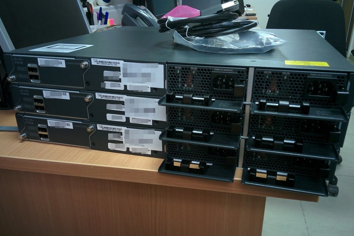 - Подключаем коммутаторы стековыми кабелями. Первый порт SW1 ко второму порту SW2, первый порт SW2 ко второму порту SW3, первый порт SW3 ко второму порту SW1.