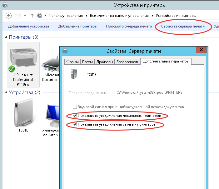 - запустите "Устройства и принтеры" -> (выделите любой принтер) -> Свойства сервера печати -> Дополнительные параметры