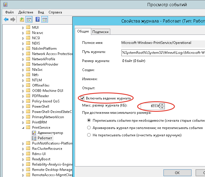 - Включите и настройте журнал событий задания печати на нужном сервере печати: