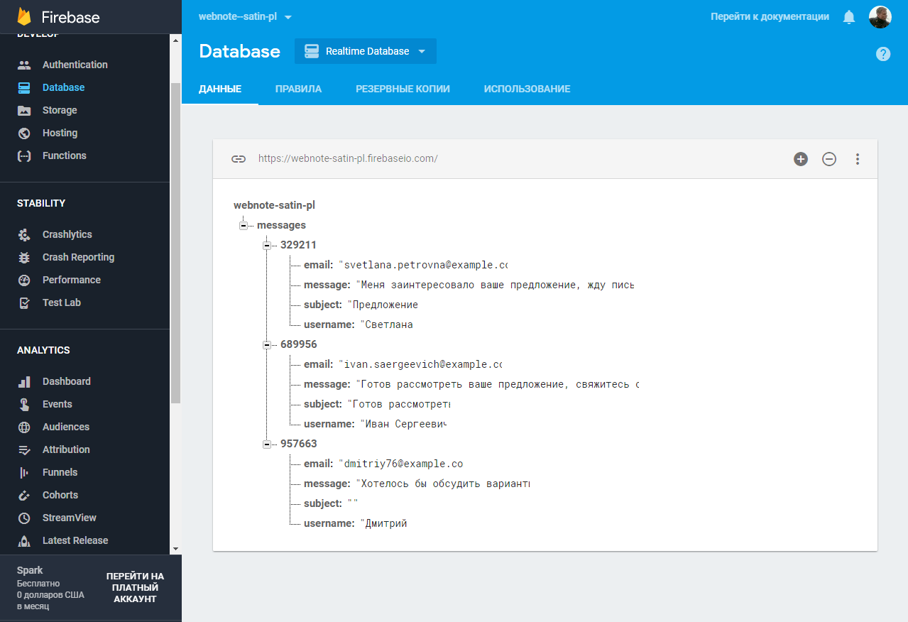 Пример реализации формы обратной связи для лэндинг страницы без использования PHP. Оповещение администратора/владельца страницы предусматривается отправкой push уведомления из Firebase (пока не реализовано). Авторизация и валидация пропущена, для упрощения примера.
