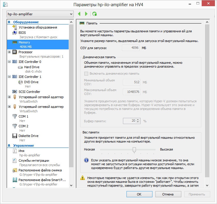 ESXi сервера под рукой нет, запустил на Hyper-V. В параметрах виртуальной машины Hyper-V нужно добавить два Legacy сетевых адаптера и отключить динамическую память. У меня запустился с одним vCPU и 4 Гб ОЗУ. Сконвертировал виртуальный жесткий диск.