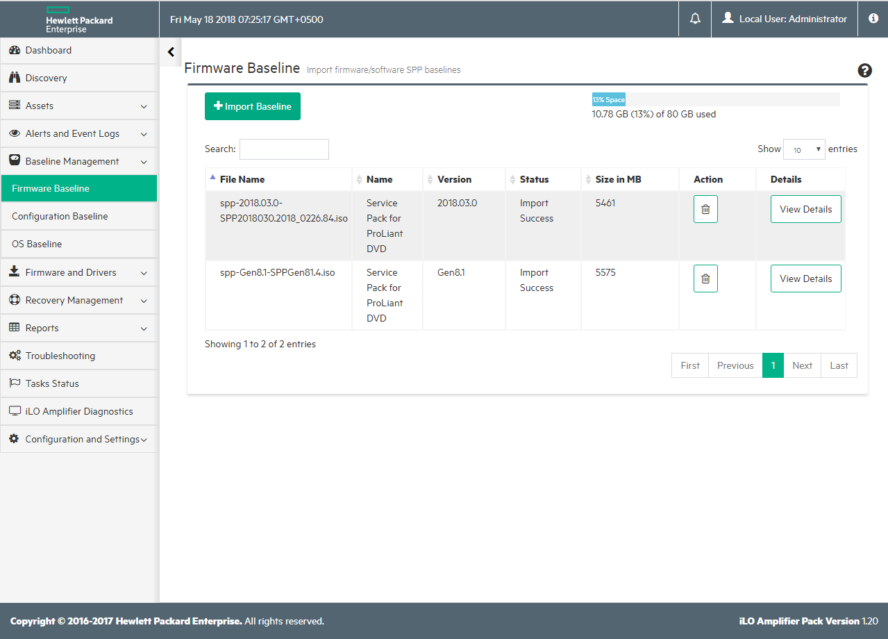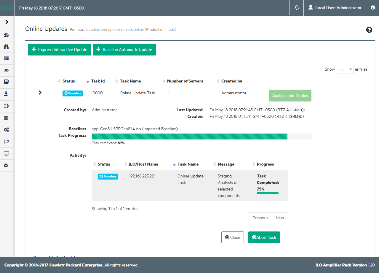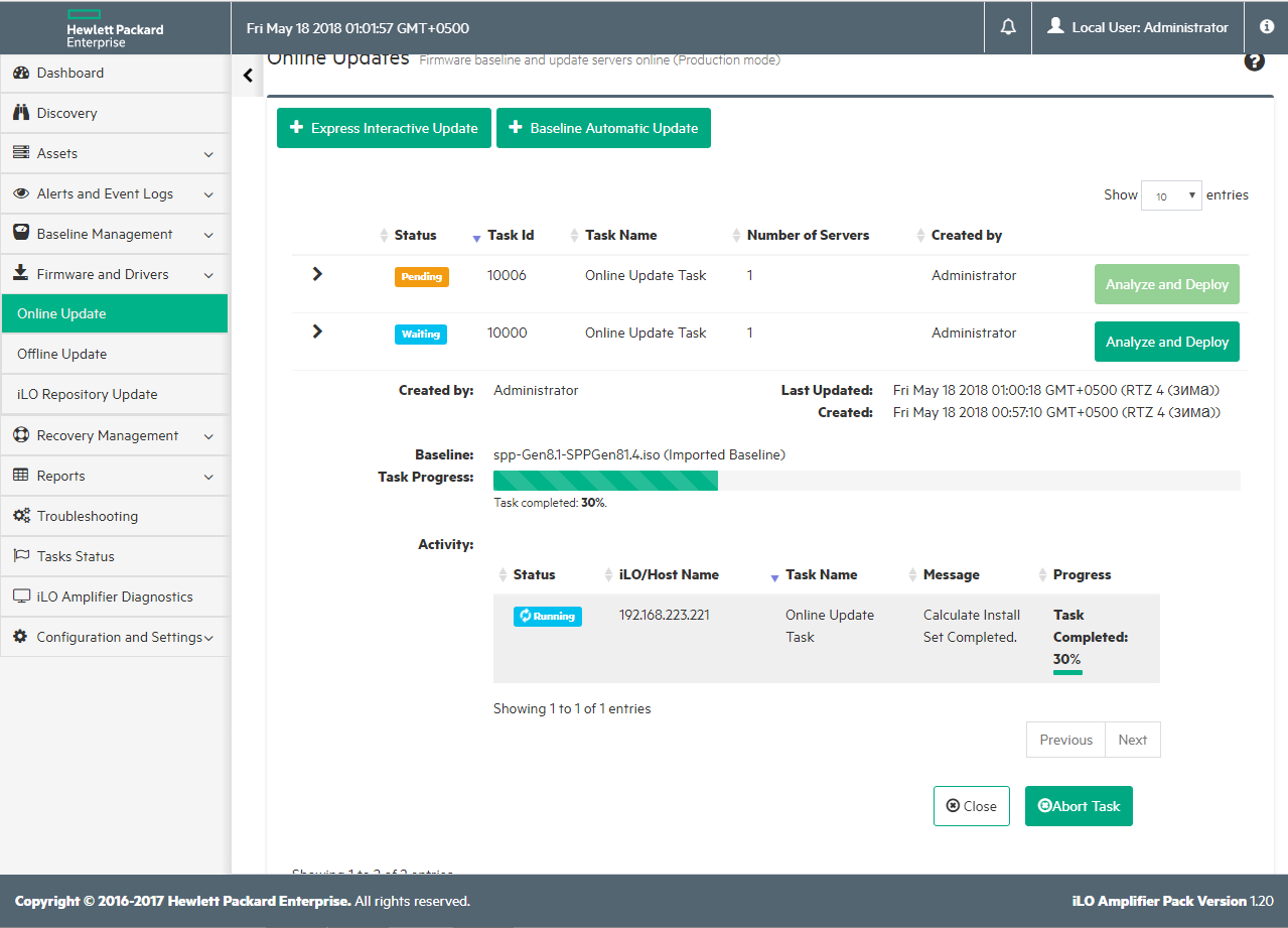 Далее в разделе Firmware Baseline добавляем последние образы Service Pack for ProLiant, затем добавляем серверы в разделе Server Management. Запускаем инвентаризацию серверов. Запускаем обновление в разделе Online Updates - Express Interactive Update или Baseline Automatic Update.
